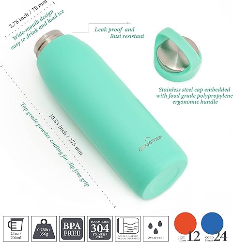 Grandties Gourde de sport isotherme de 700 ml avec couvercle ergonomique anti-fuite avec poignée – Gourde à double paroi en acier inoxydable garde jusqu'à 24 h/12 h au chaud (blanc) ZL001210701