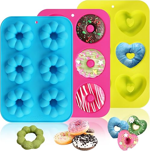 AUTOWNLUX 3 Pièces moule à donuts en silicone, 6 cavités Donut Baking Pan Plateau de Cuisson Antiadhésive, Moule a Donuts Convient pour Gâteaux Bagels Biscuits Muffins (Coeur, Rond, Citrouille)