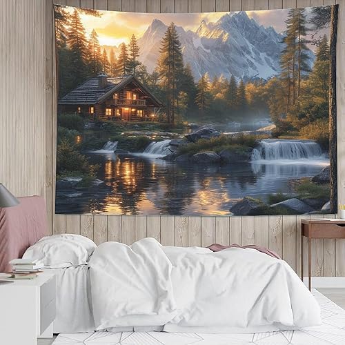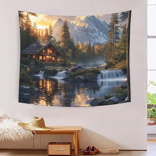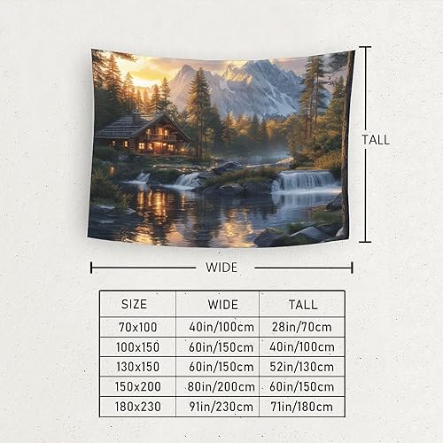 EVMILA 3D Chalet de montagne et forêt Impression Murale Couverture Décor Maison Poster Art Tapisserie Tenture Murale Polyester Doux Pour Chambre Salon Dortoir Déco 100cmx150cm