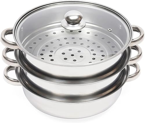 POTYYH Cuiseur vapeur à 3 couches, 28 cm, avec couvercle en verre, double poignée, pour cuisinières à induction, cuisinières électriques en céramique, fours électriques ou cuisinières à gaz