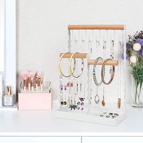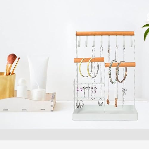 Porte bijoux, porte collier Présentoir de boucle d'oreille Arbre à bijoux avec plateau à anneaux en bois et crochets de rangement Colliers, bracelets, anneaux White