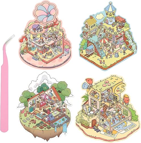 CATOR 4 Sets Autocollants de Scène,3D Stickers Scene Miniature avec Pincette,Amusants Autocollant 3D, 3D House Stickers DIY Mini chalet et jolie scène chaleureuse, pour Adultes, Enfants(B)
