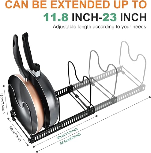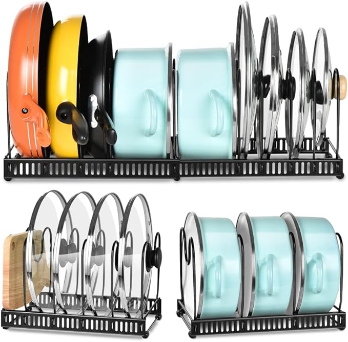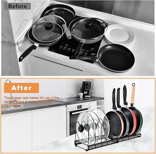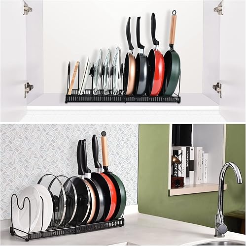 aceyoon Porte Casseroles Extensible avec 10 Compartiments Réglables, Range Couvercle pour Tiroir Cuisine Organiseur de Poêle sous Évier avec Porte Couvercle Mural Supplémentaire, Métal 30-58.5cm
