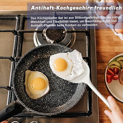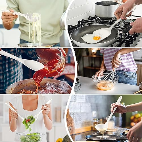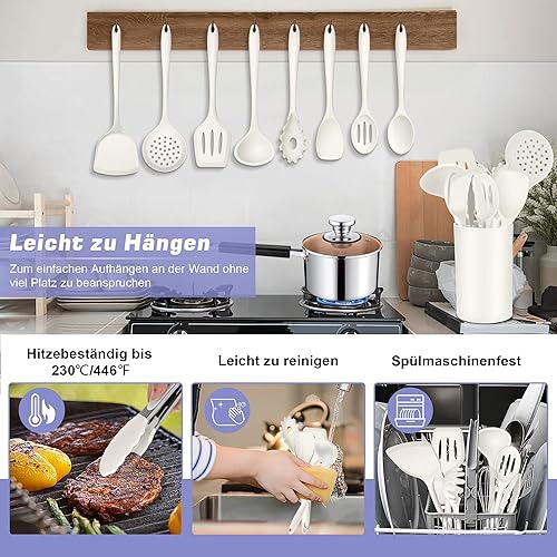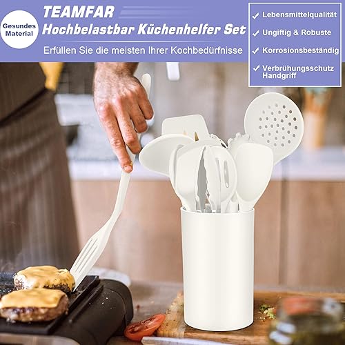 TEAMFAR Lot de 11 ustensiles de cuisine en silicone, antiadhésifs, avec porte-ustensiles, résistants à la chaleur, pour la cuisine, sains et faciles à nettoyer, blancs