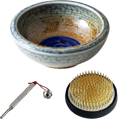 Wazakura Kit Outils Ikebana et Arrangement Floral Fabriqué au Japon, Vase à Fleurs en Terre Cuite Minoyaki Marron et Bleu, Support Pique Fleurs Kenzan 61 mm, Accessoire Maintenance Aiguilles