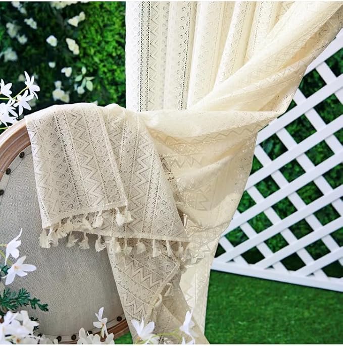 RunFar shop Lot de 2 rideaux bohème, beiges, vintage, rétro, français, crochet, transparents, en dentelle, pour salon, chambre à coucher, l 140 x H 150 cm