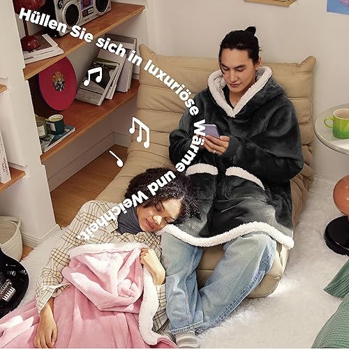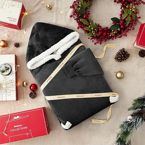 Bedsure Pull Plaid a Capuche - Pull Plaid Femme Adulte Chaud, Plaid à Manche Homme Polaire avec Poches Portables et Fermeture Éclair, Pull Plaid Pull Couverture a Capuche Hiver, 110x90 cm Anthracite