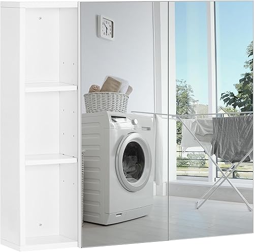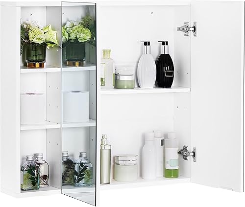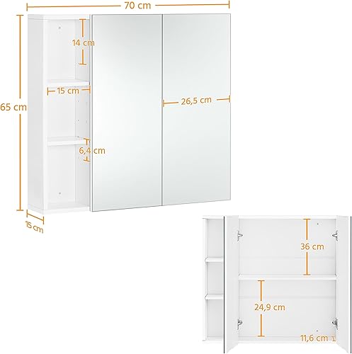 Abician Armoire Murale Salle de Bain Armoire de Rangement Moderne en Bois avec 2 Portes Miroir 3 Casiers 1 Étagères Réglables en Hauteur pour Buanderie Vestiaire 70 cm × 65 cm × 15 cm, Blanc