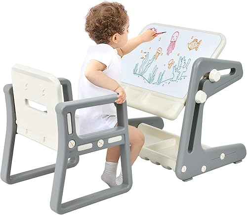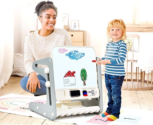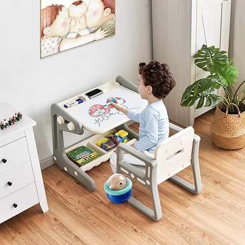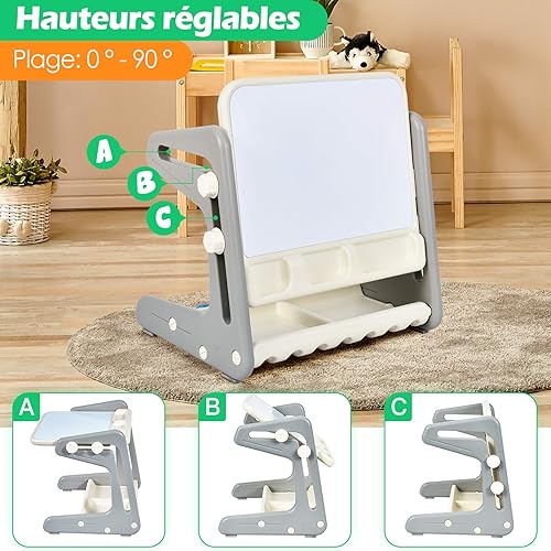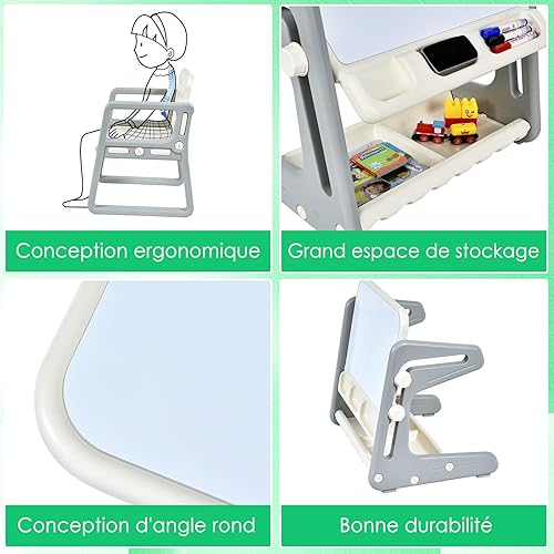 GOPLUS 2 en 1 Ensemble de Table à Dessin Multifonctionnel avec Chaise pour Enfants, Chevalet à Dessin avec Tableau Blanc Magnétique et Étagères, Inclinable 0°-90°, Hauteur Réglable (Rose)