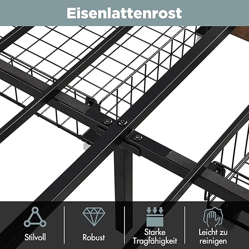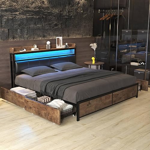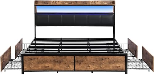 KOMHTOM Lit 2 Personnes avec LED et 4 Tiroirs de Rangement,Tête rembourrée PU,Cadre de Lit Plateforme,Sommier à Lattes,pour Adultes, Adolescents(sans Matelas) (160x200cm)