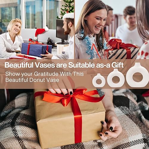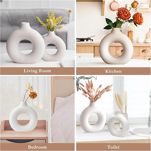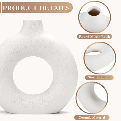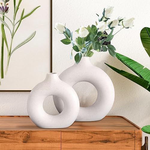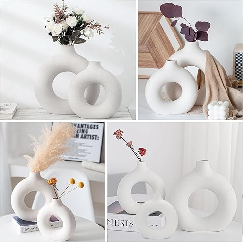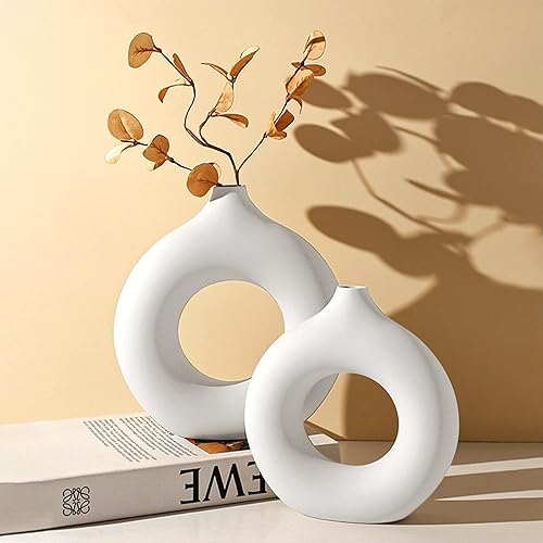 GUHAOOL Vase en Céramique en Donut Blanc, Lot de 2 Vase Céramique Moderne, Vases Ronds Mat pour Herbe de la Pampa pour La Décoration Salon,Chambre à Coucher,Table à Manger,Vase Artisanat Cadeau (M+S)