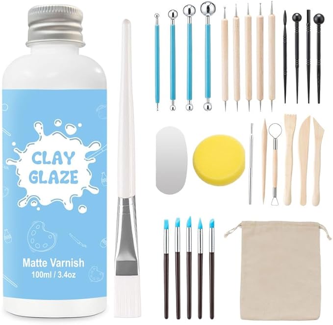EIGTWEN 100 ml vernis argile autodurcissante et 29 pièces outils poterie, Gloss vernis argile protège l'argile de l'usure superficielle, outils sculpture argile peut être utilisé pour sculpture(Gloss)