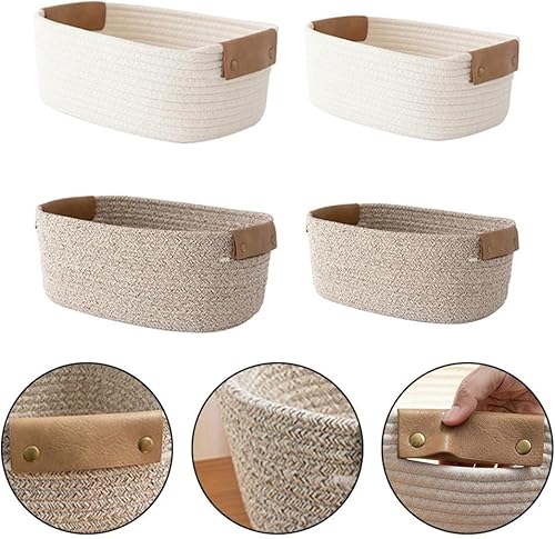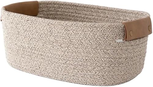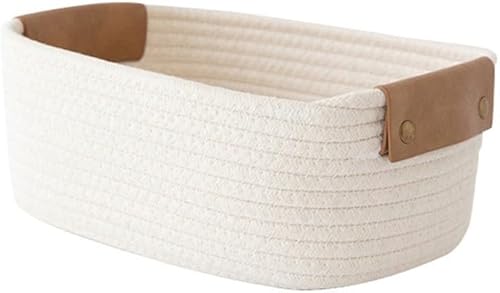 Panier de rangement décoratif en corde de coton tissé fabriqué à la main pour la maison, le bureau, la chambre d'enfant, poubelle portable polyvalente avec poignées en cuir (blanc S)