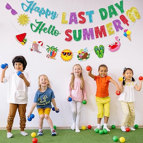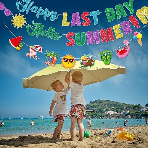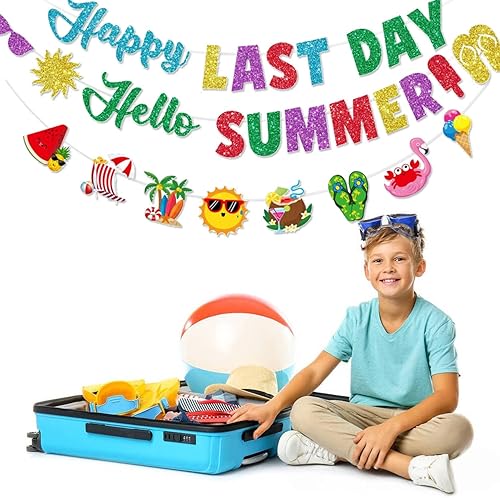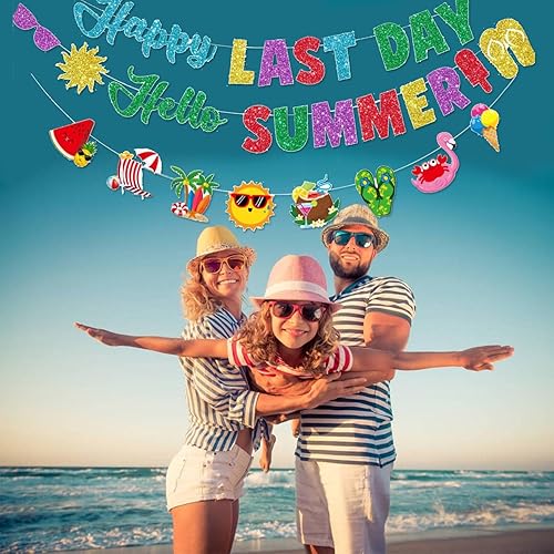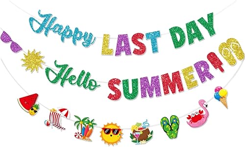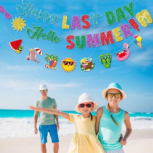 Bannière Happy Last Day, Hello Summer - Décorations de fête de fin d'année scolaire - Bannière pour le dernier jour d'école - Accessoires de fête pour les vacances d'été