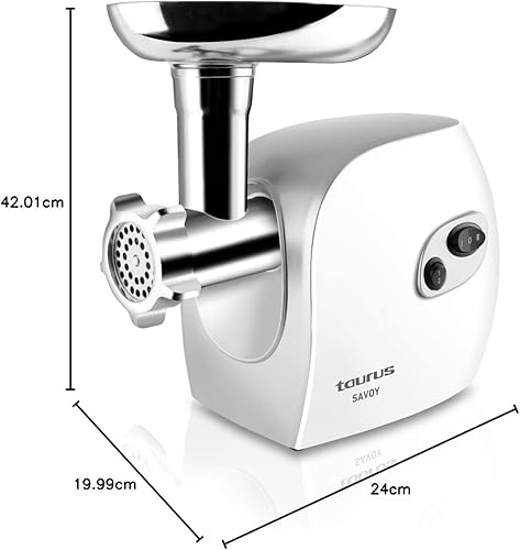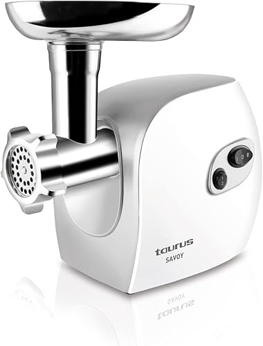 Taurus Savoy - Hachoir à viande 450W, Fonction avant/arrière, 3 lames de tailles différentes, Accessoires : adaptateur à kebbés et adaptateurs à saucisses