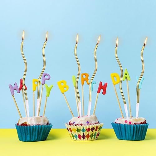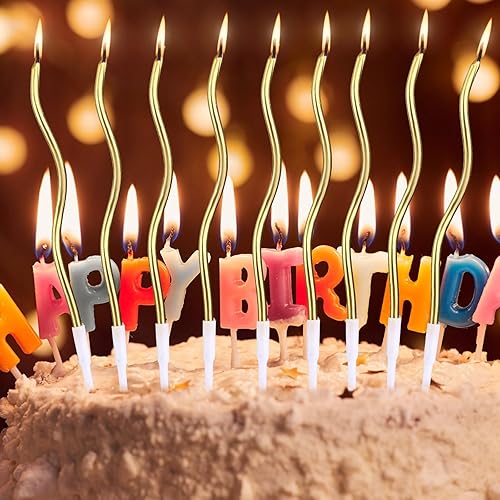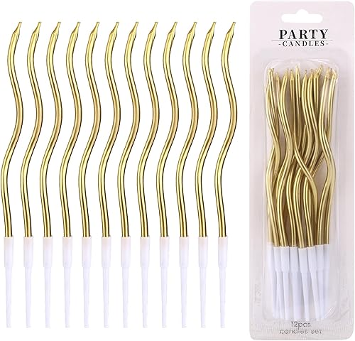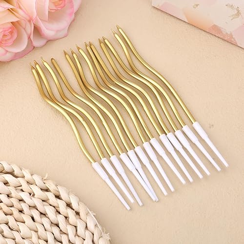 lasuroa 12pcs Bougies Spirales pour Gâteau, Bougies Minces Longues Torsadées avec Support pour Anniversaire, Mariage, Fête, Décoration Cupcake (Or)