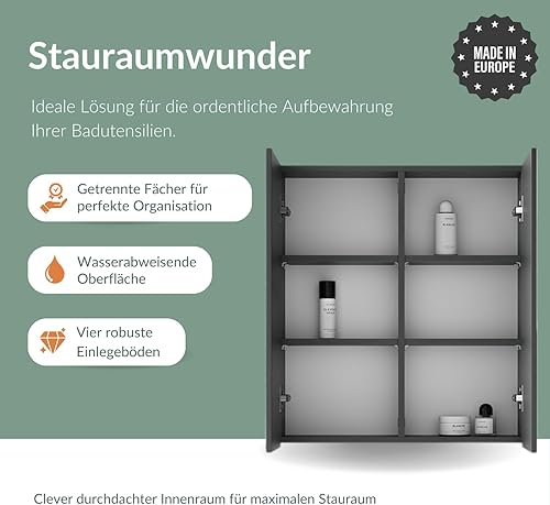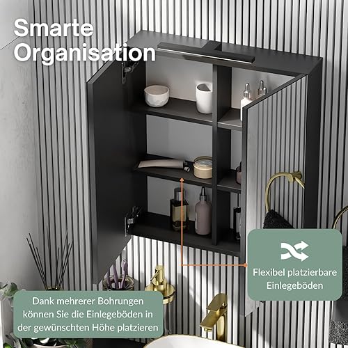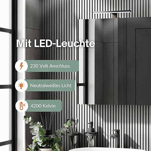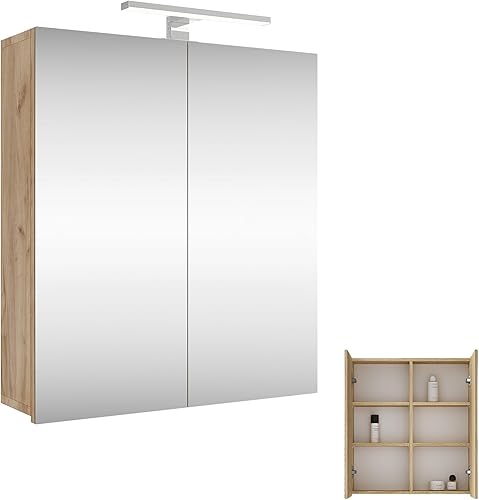 Planetmöbel Merkur Armoire de salle de bain à miroir avec éclairage de 60 cm de large - Armoire de salle de bain suspendue avec miroir - Éclairage LED chromé - Chêne doré