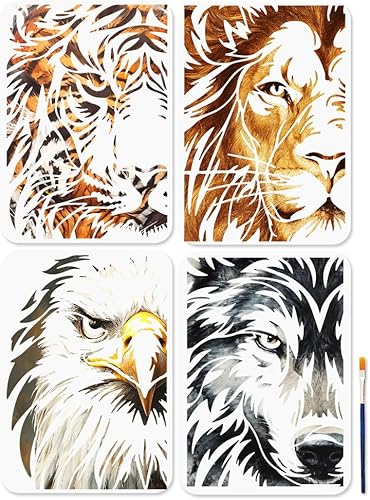 MAYJOYDIY 4 Pochoir A4 sur le Thème des Animaux Modèle pour Peinture Tigre Lion Loup Aigle 29.7 × 21cm avec Pinceau Réutilisable pour Travaux Manuels Sur Fenêtre Bois Mur Décoration D'Intérieur