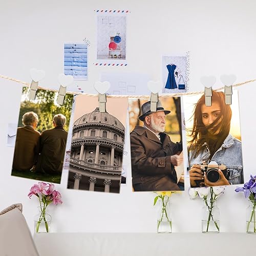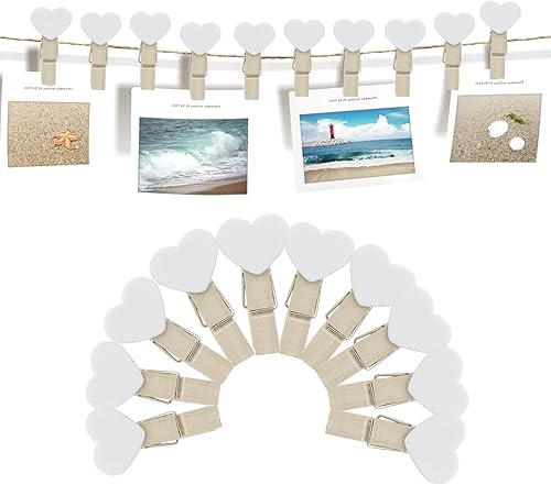 Feelorna 20 pièces Mini Pinces à Linge en Bois, Mini Pinces à Linge en Forme de Coeur avec 2 mètres de Corde de Jute, Mini Pinces à Linge en Bois pour la décoration de Photos DIY (Blanc)