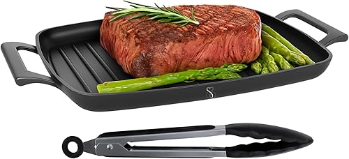 Stone&Stone Poêle grill anti-adhésif 28 cm | plaque carrée avec poignée amovible | fond induction 100 % acier | four et gaz | revêtement allemand Greblon C3+ | 1 pince incluse