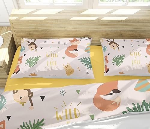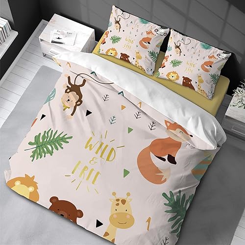 JGGXHM Housse de Couette pour Enfants, Motif Dessin animé, Singe, Girafe, Renard, Ours, Ensemble de literie sur Le thème des Animaux du Zoo, Housse de Couette, décoration200 x 200 cm - 50 x 75 cm x 2