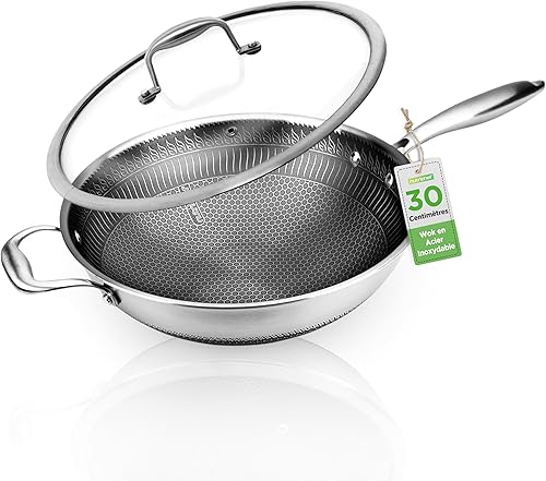 NutriChef-Wok 30 cm, Poêle wok en Acier Inoxydable, Couvercle en Verre, Revêtement Antiadhésif avec Gravure DAKIN, Résistant aux Rayures,Pour Induction, Gaz, Electricité et Céramique