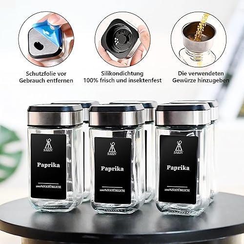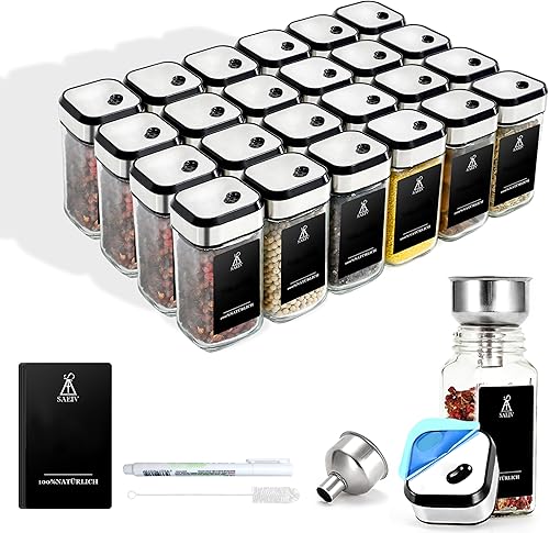 SIAZIH Lot de 24 pots à épices en verre rotatif à 360° | Trois calibres réglables | 24 pots à épices avec étiquettes | Organisation parfaite pour la cuisine | Boîtes à épices en verre de 120 ml