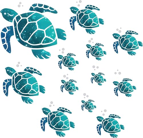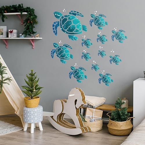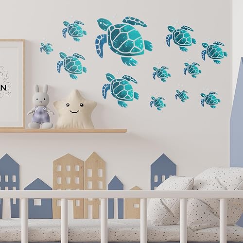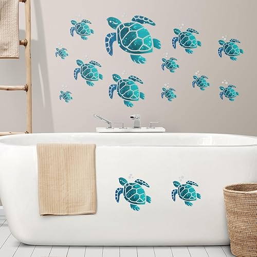 Lot de 12 autocollants muraux en vinyle motif tortue de mer, pour salle de bain, maison, bureau, chambre d'enfant, toilettes (12 tailles, bleu vert)