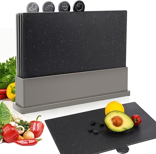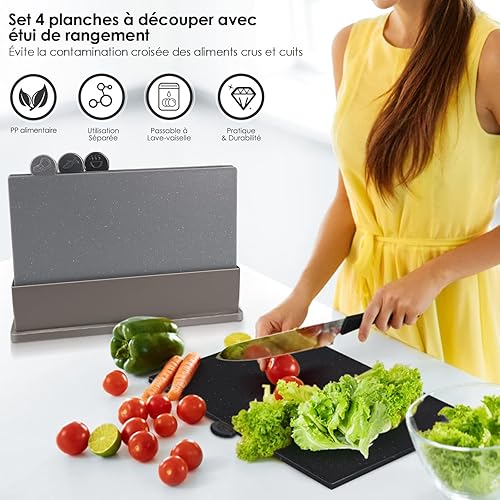 MASTERTOP Ensemble de 4 Planches à Découper Index, Planche à Découper Plastique Antidérapant avec Etui de Rangement, Plateau à Découper pour Préparation Séparée des Différents Aliments