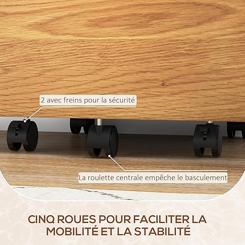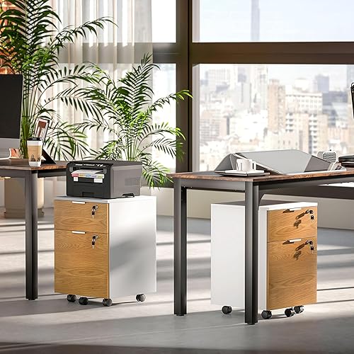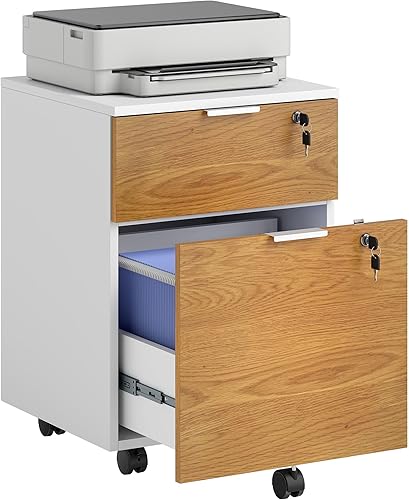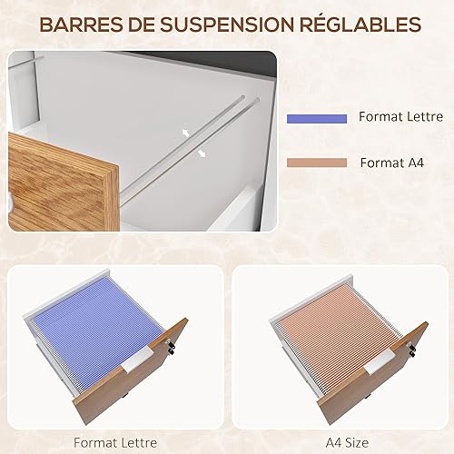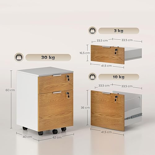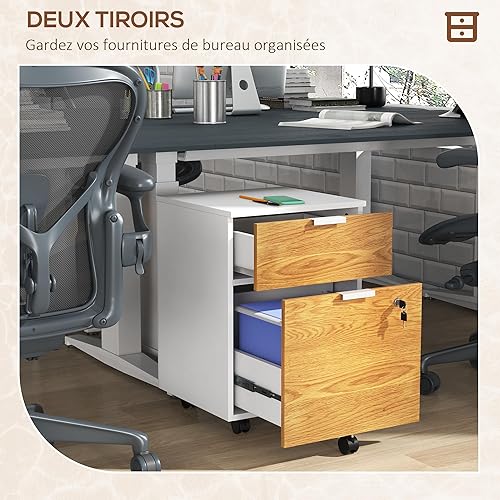 HOMCOM Caisson de Bureau, Meuble de Rangement 2 tiroirs 2 Barres de Suspension Dossier Suspendu, verrouillable 2 clés, 4 roulettes 42x40x60 cm Effet Bois Blanc et Naturel