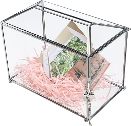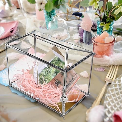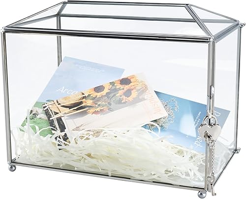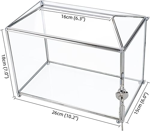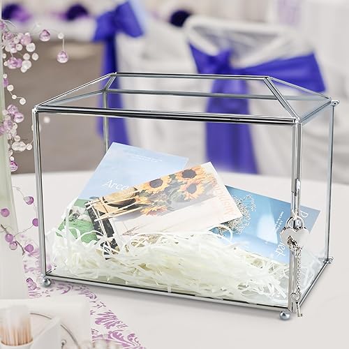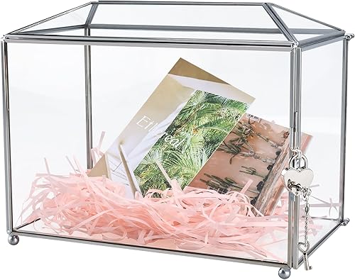 Homtone Grande boîte à cartes de mariage en verre de 26 cm avec fente et serrure, boîte en verre géométrique pour terrarium argenté, boîte de présentation vintage pour réception de mariage, centre de