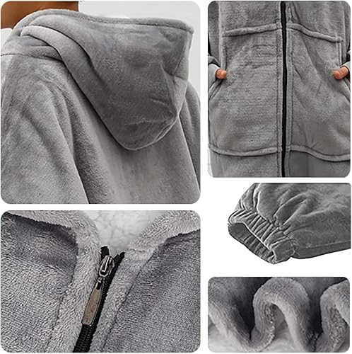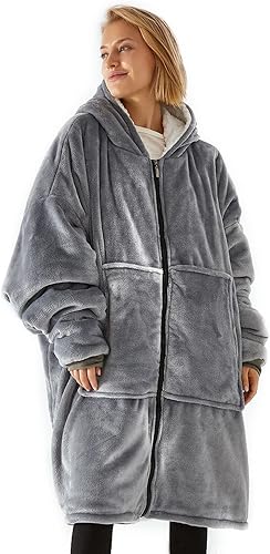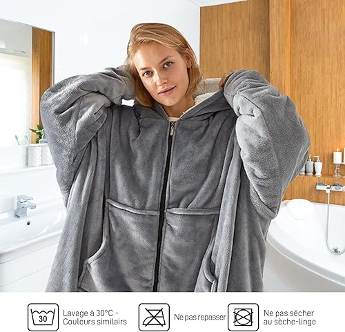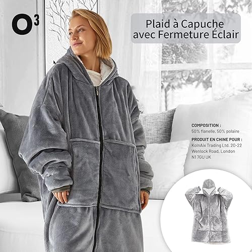 O³ Pull Plaid Géant [ Taille XL - Fermeture Éclair ] Couverture avec Manches et Capuche en Polaire - Ultra Doux et Chaud - Idéal pour Les Nuits d'hiver