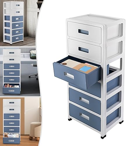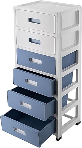Système de rangement à tiroirs, en plastique, avec roulettes, à 6 tiroirs, tour de rangement en plastique, organiseur pour bureau, salon (bleu, blanc)