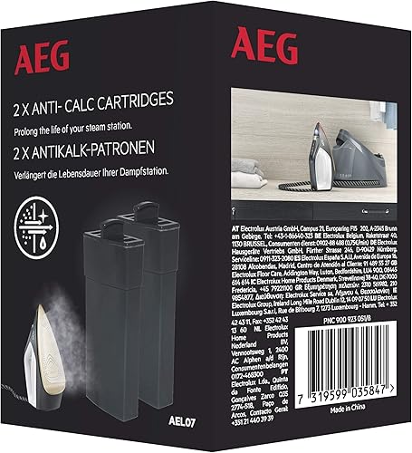 AEG AEL07 Lot de 2 cartouches anticalcaire pour station de repassage vapeur ST7 et ST8 (prévention de la calcification, filtration haute efficacité, changement de filtre, accessoires station de