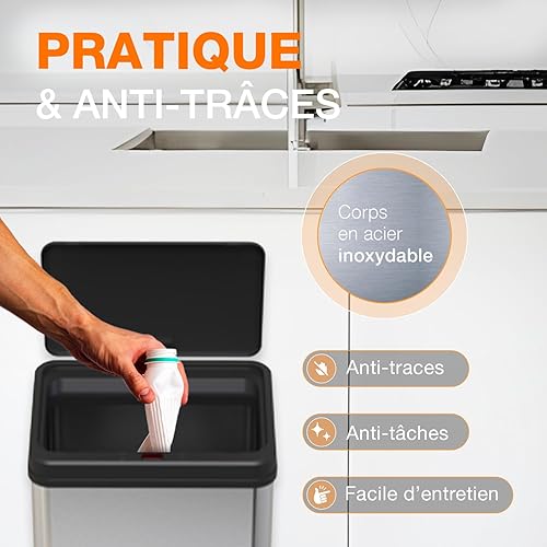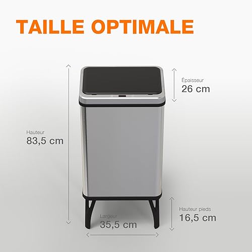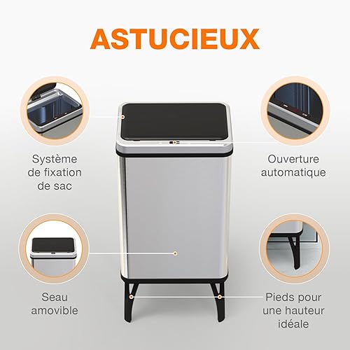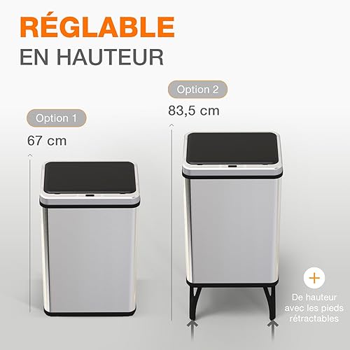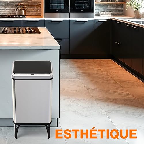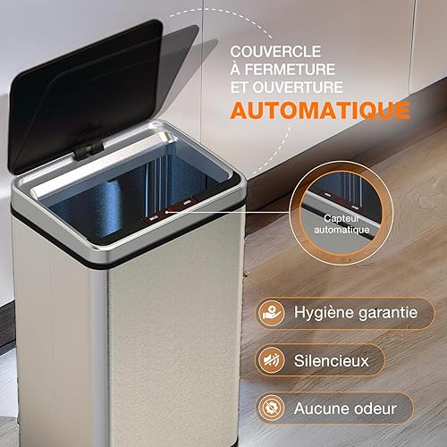 CATAVANA Poubelle Automatique Pliable 50L - Poubelle à Capteur Résistante aux Empreintes - Couvercle à Fermeture Douce avec Fonction Manuelle en Option - Argenté et Noir