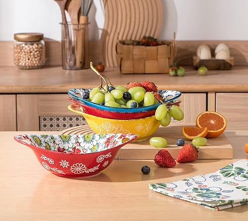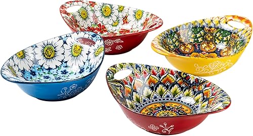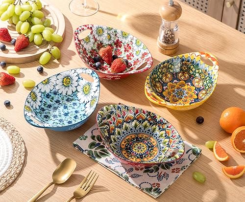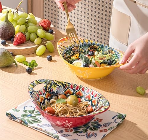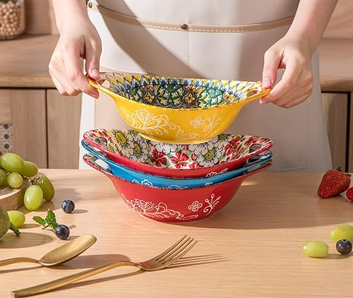 Henten Home Bols à Salade avec Poignée, Grand Bol à Céréales en Porcelaine de 560 ml, Assiette Creuse en Céramique Passent au Micro-ondes et Lave-vaisselle - Bols Colorés - Style Bohème
