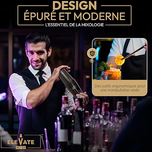 Kit de Cocktail de Luxe Elevate Mix - Ensemble Complet 14 Pièces en Acier Inoxydable Noit Mat avec Shaker 750 ML- Support en Bambou -Kit de mixologie-Professionnel- Barman et Amateur