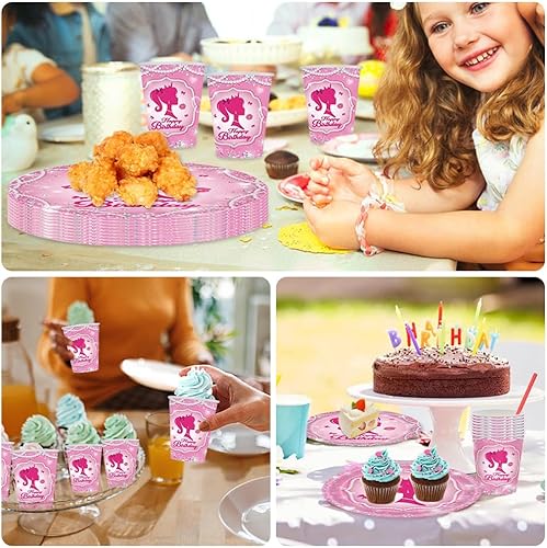Riisoyu 68 Pièces Bar-bie Vaisselle Anniversaire Fête, Princesse Ensemble Vaisselle Papier Set Princesse Barbi Fournitures de Fête d'anniversaire Assiettes de Vaisselle Tasses Serviettes pour Filles