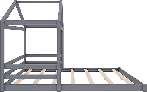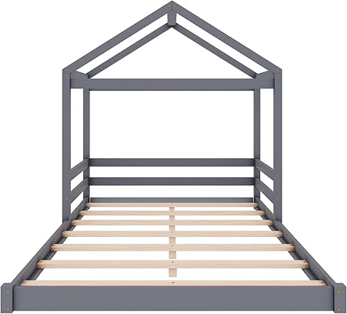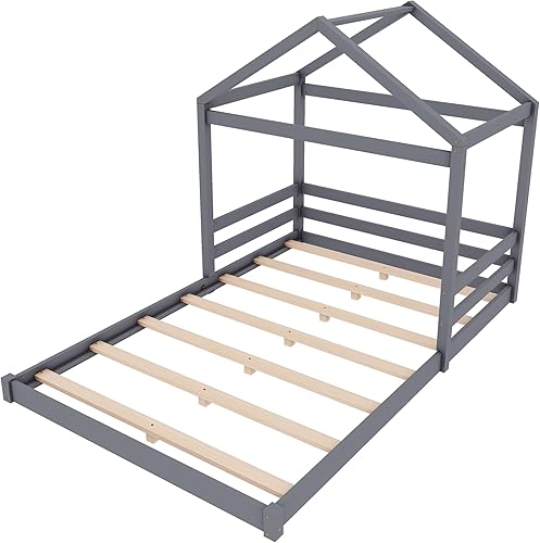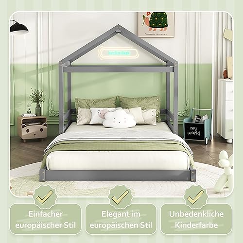 Seyakany Lit Cabane Enfants 140x200, Lit au Sol avec Sommier à Lattes, Lits Montessori avec Toit, Cadres de lit pour Enfants, Bois de pin, Gris