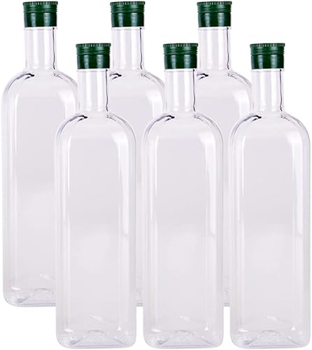 B SEPOR Lot de 6 bouteilles vides en plastique Quadra PET transparent de 1 litre d'huile d'olive avec bouchons (1000 ml) – Bouteilles de vin carrées à long col pour arrosage des plantes
