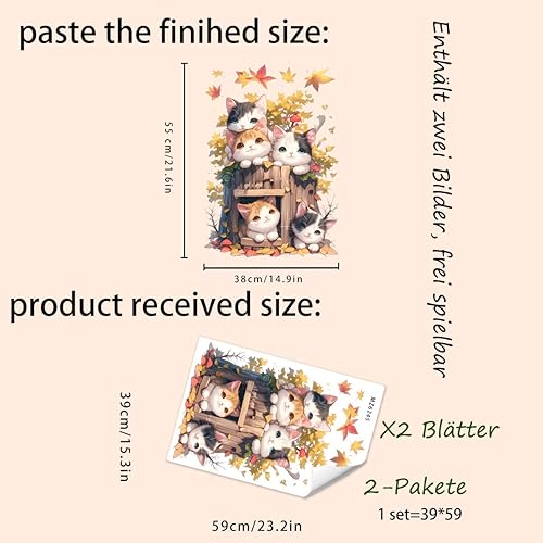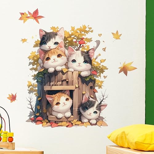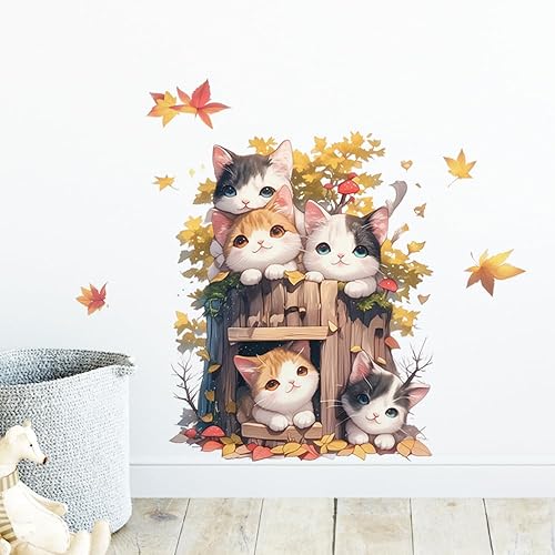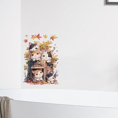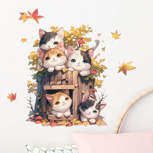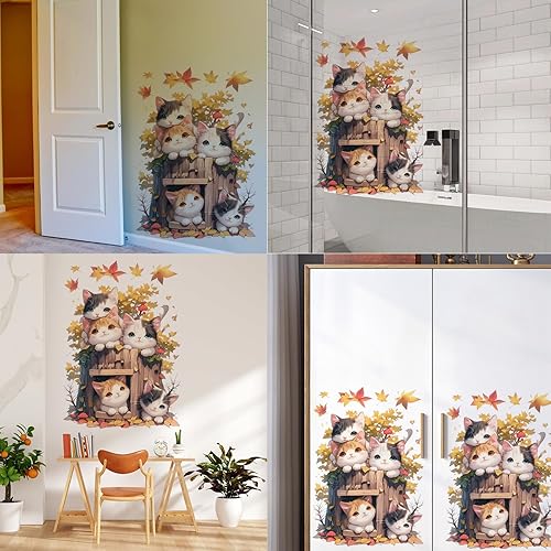 Lot de 2 feuilles d'autocollants chat - 38 x 55 cm - Chats avec automne - Feuilles d'érable autocollantes - Couvercle en PVC - Mignon - Pour maison, fête, magasin, cuisine, réfrigérateur, salle de