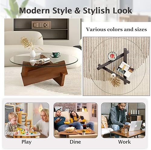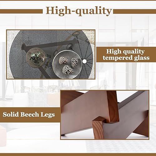 DazzlingZLL Table Basse Doré en Verre Trempée, Table Basse Ronde Salon, Cadre en Bois Massif, Tables d'appoint pour Canapé Bureau Balcon 80 cm (Brun)