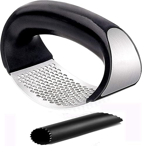 Oldpard Presse-ail de cuisine en acier inoxydable 304 de qualité alimentaire pour gingembre, économie de main-d'œuvre, avec éplucheur d'ail et brosse de nettoyage (noir/argent)