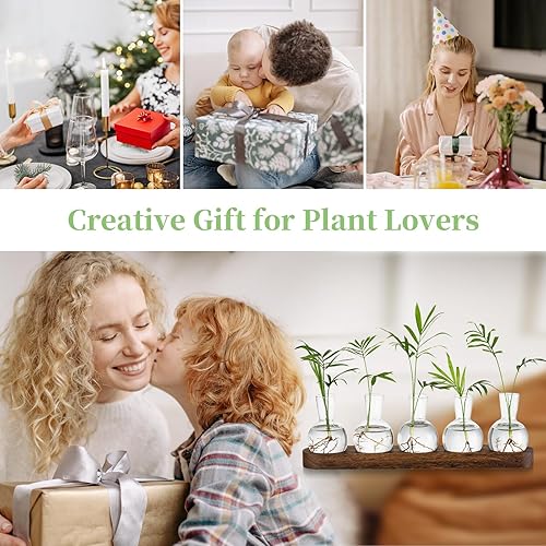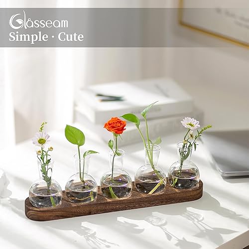 Glasseam Station De Propagation De Plantes en Terrarium, Vase à Bulbes en Verre avec Plateau en Bois, Vases à Bourgeons Modernes pour Le Salon Et Le Bureau, Vase à Fleurs De Bureau