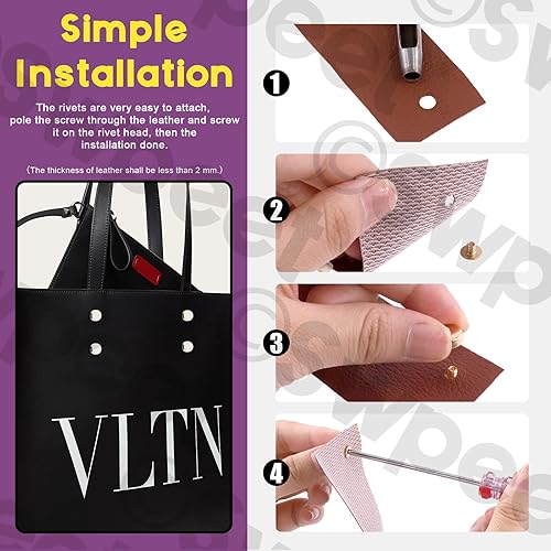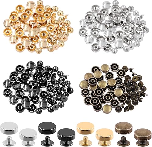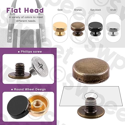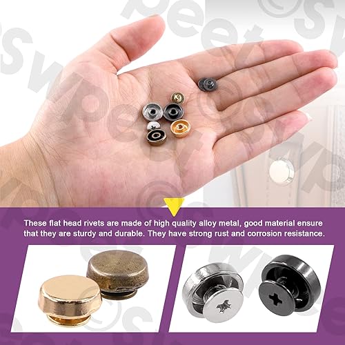 Swpeet 32pcs or vis vis clous Kit, rond portefeuille pied métal rivets, pieds clous tête plat snap cap rivets, or métal tête plate portefeuille pied rivets cuir artisanat DIY