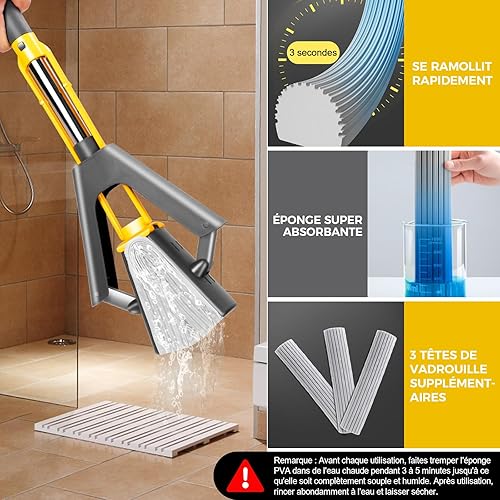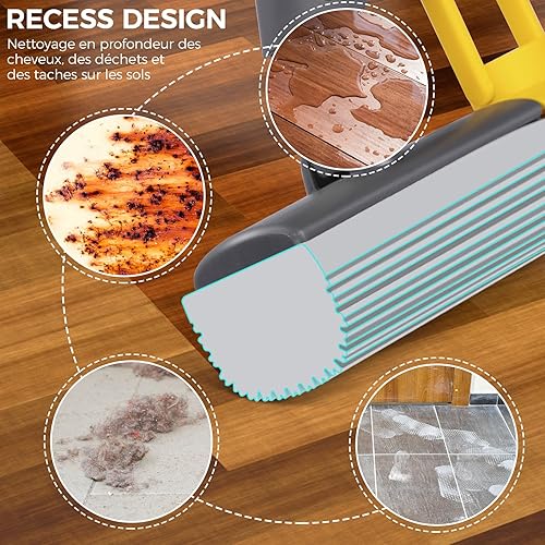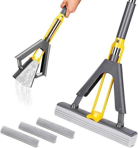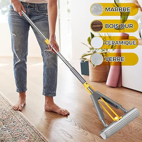 Midyb Balai Éponge Absorbant, Balai Serpillère Éponge avec 3 Super Absorbant Réutilisables PVA Éponge Head, 123cm Manche Télescopique Serpillere Nettoyage Sol pour Sols en Bois, Carrelage