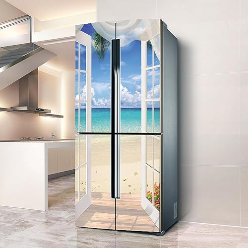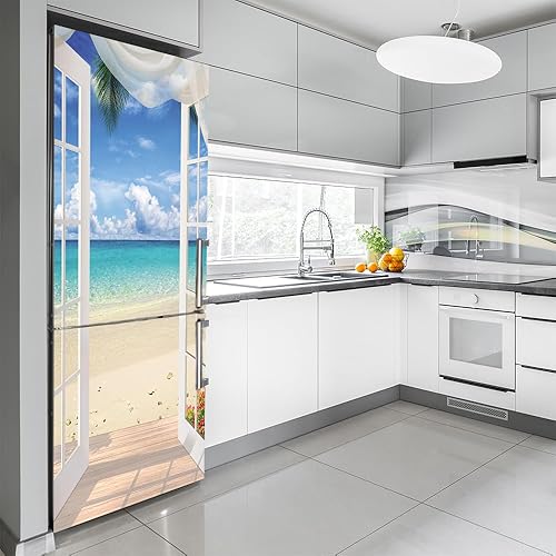 Stickers autocollants pour frigo, autocollant de réfrigérateur couvrant entièrement la porte du réfrigérateur, autocollants muraux pour décalcomanie cuisine, paysage marin de plage de fenêtre blanche