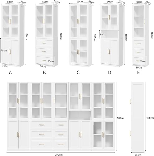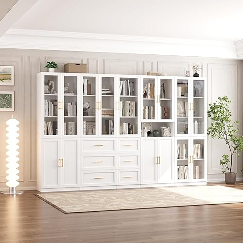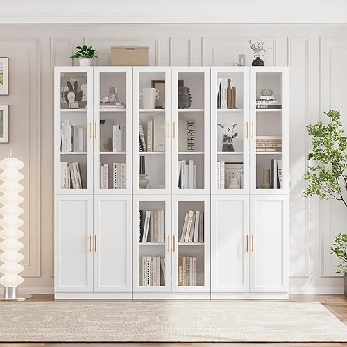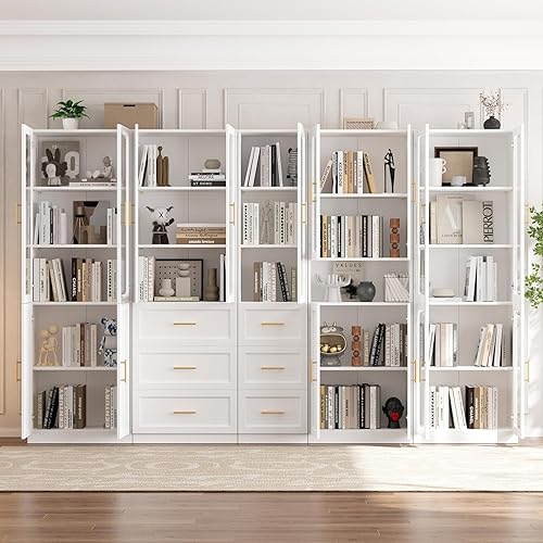 VOWNER Bibliothèque avec Portes en Verre, Étagère à 5 Niveaux avec Tablette Réglable, Ensemble de Vitrine de Rangement Moderne pour Bureau, Salon, Blanc(ACA)