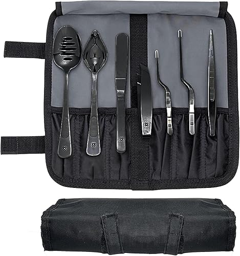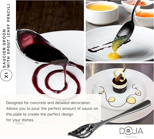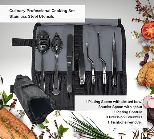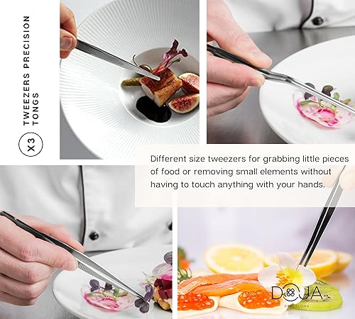 DOJA Barcelona | Outil de Placage de Chef Professionnel | Couleur: Noir | 7 Pièces avec Etui | pour Cuisine | Cuillere Perforee, Pincettes Pince Pinces Cuisson, Poisson, Crayon de Chef, Spatule...