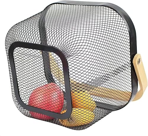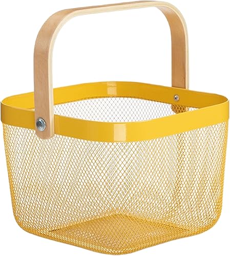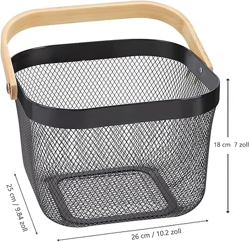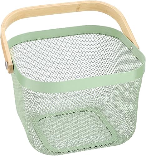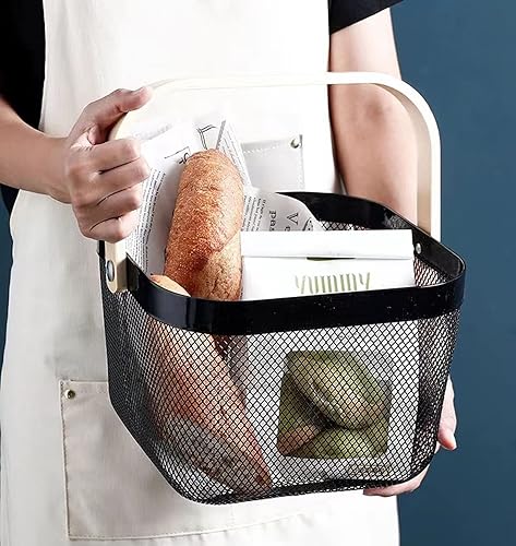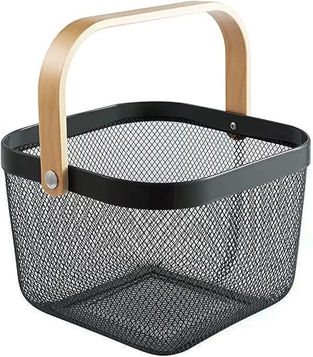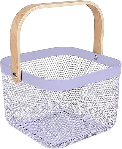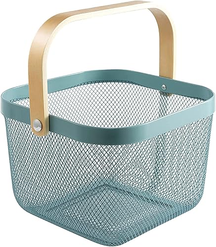 HOJKMA Panier de rangement en maille d'acier avec anse en bois, panier de rangement multifonctionnel en fil métallique à suspendre, idéal pour la cuisine, la salle de bains, les courses, bleu